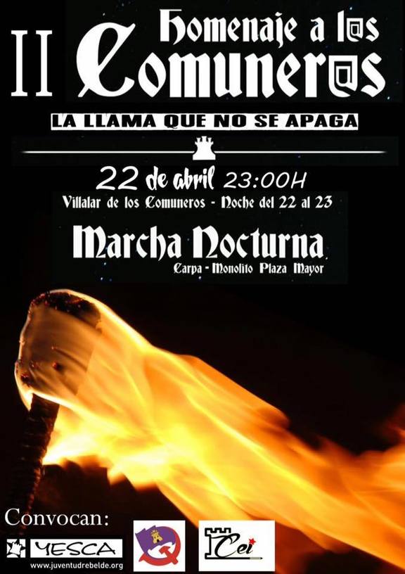 Comuneras y comuneros este viernes por segundo año marcharemos en la marcha nocturna hacia el monolito para depositar una ofrenda floral. Este año convocamos junto con Comunistas de Castilla y el Concejo de Estudiantes Independientes (CEI), pero deseamos que el año que viene seamos much@s más. Hacemos un llamamiento a todo el mundo acudir con su pendón a las 23:00, en la carpa del MPC para salir tod@s junt@s y honrar a quienes lucharon por la libertad de nuestra tierra como se merecen. ¡Nos vemos en Villalar, que nuestras antorchas mantengan viva la llama comunera!