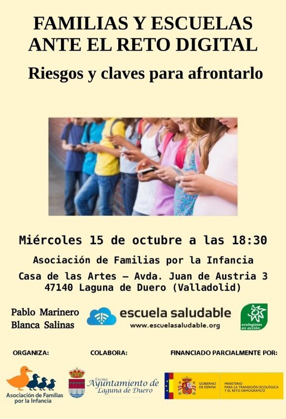 La Asociación de Familias por la Infancia de Laguna de Duero (Valladolid) organiza el próximo miércoles 15 de octubre a las 18:00 h, una charla-debate sobre «Familias y escuela ante el reto digital. Riesgos y claves para afrontarlo», para informar y sensibilizar sobre el uso de los medios digitales en el ámbito familiar, docente y social, así como de las consecuencias de su inicio precoz y desregulado.