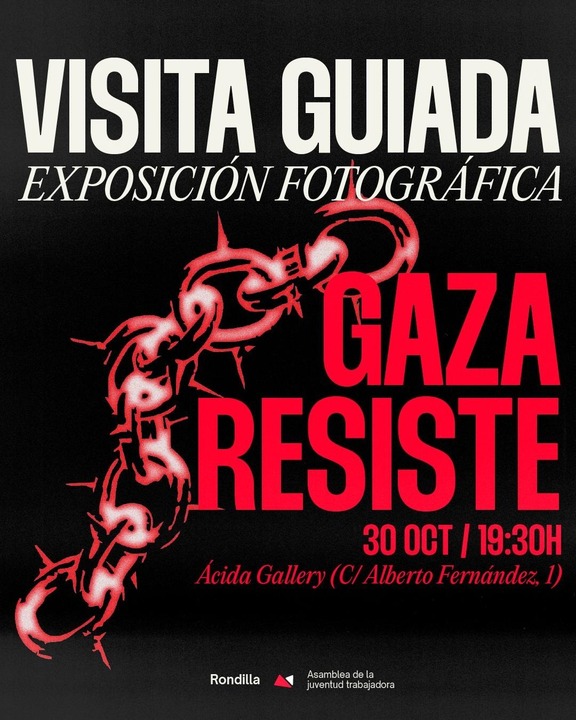 Desde AJT Rondilla organizamos una visita guiada a la exposición de fotografía "Gaza resiste" con fotos del colectivo de fotógrafos palestinos "Activestills Collective", tomadas este verano en Gaza, siendo testigos del genocidio perpetrado por el Estado de Israel.