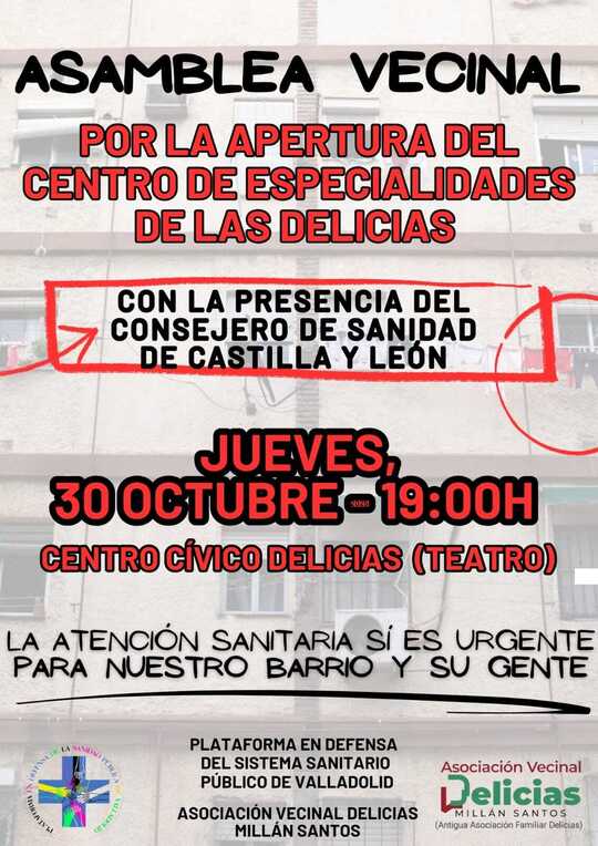 El próximo jueves 30 de octubre se realizará a las 19h una asamblea en el Teatro del Centro Cívico que tendrá como eje principal la exigencia de reapertura del Centro de Especialidades Delicias de la Calle Trabajo. Desde que ese Centro -esencial para la atención sanitaria en el barrio- cerró, se iniciaron las movilizaciones para su reapertura: numerosas manifestaciones por el propio barrio, algunas hasta la Consejería de Sanidad; pronunciamientos a favor del pleno del Ayuntamiento de Valladolid (2018, 2019 y 2023) a favor de tal cuestión, etc. En el año 2019, el sábado 19 de octubre para más señas, se llevó adelante una consulta en el barrio sobre el asunto, en la que participaron 8.543 personas, de las que 8.524 se pronunciaron a favor de la reapertura.