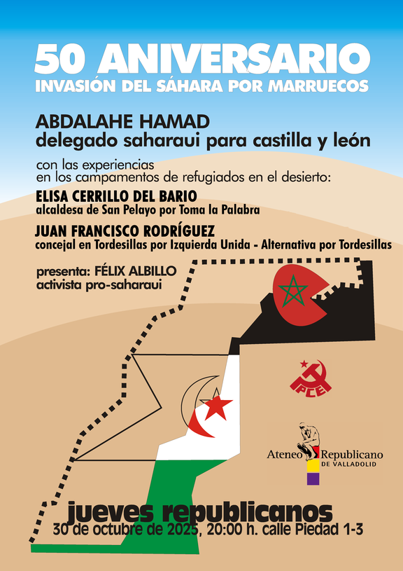 El próximo jueves 30 de octubre, a las 20:00 horas, el Ateneo Republicano de Valladolid acogerá la charla "50 aniversario de la invasión del Sáhara por Marruecos", organizada conjuntamente por el Partido Comunista de España (PCE) y el propio Ateneo.